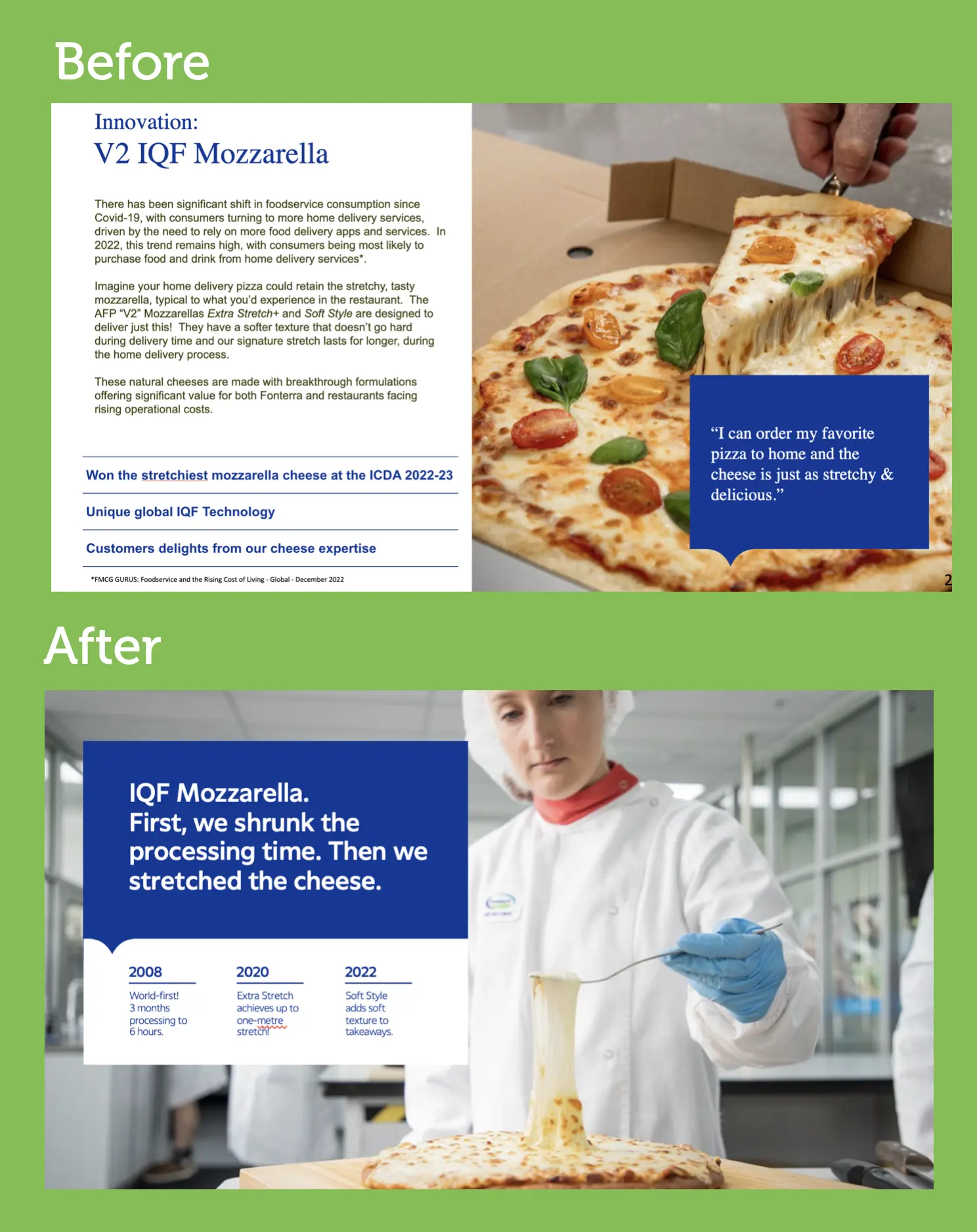 Finally, we included photography of actual scientists with quotes and names to build authenticity and used Fonterra photos as a fresh relief from 99% of other usually diagram-heavy Powerpoints.