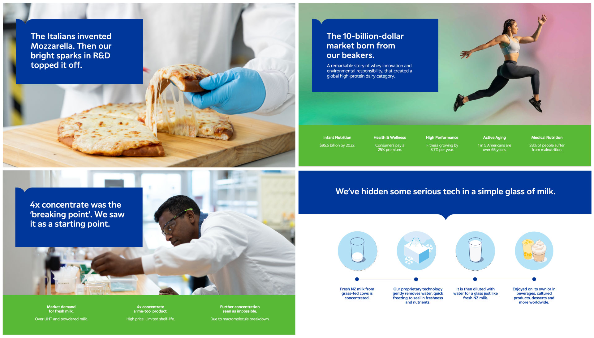 Feedback is that the teams felt the work really elevated how Fonterra showcased their R&D capabilities. There was particular appreciation for how the storytelling brought the science to life, making it more engaging and accessible. Also, the AI-generated opening visual sparked much discussion—it was seen as an innovative touch that helped set the tone for the presentation.